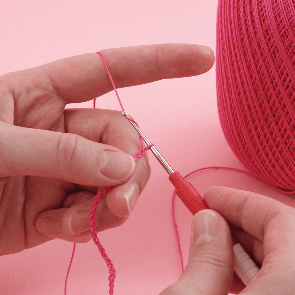 The crochet hook from Addi sits comfortably in the hand, and the white cap serves as a protective cover for the tip when not in use.