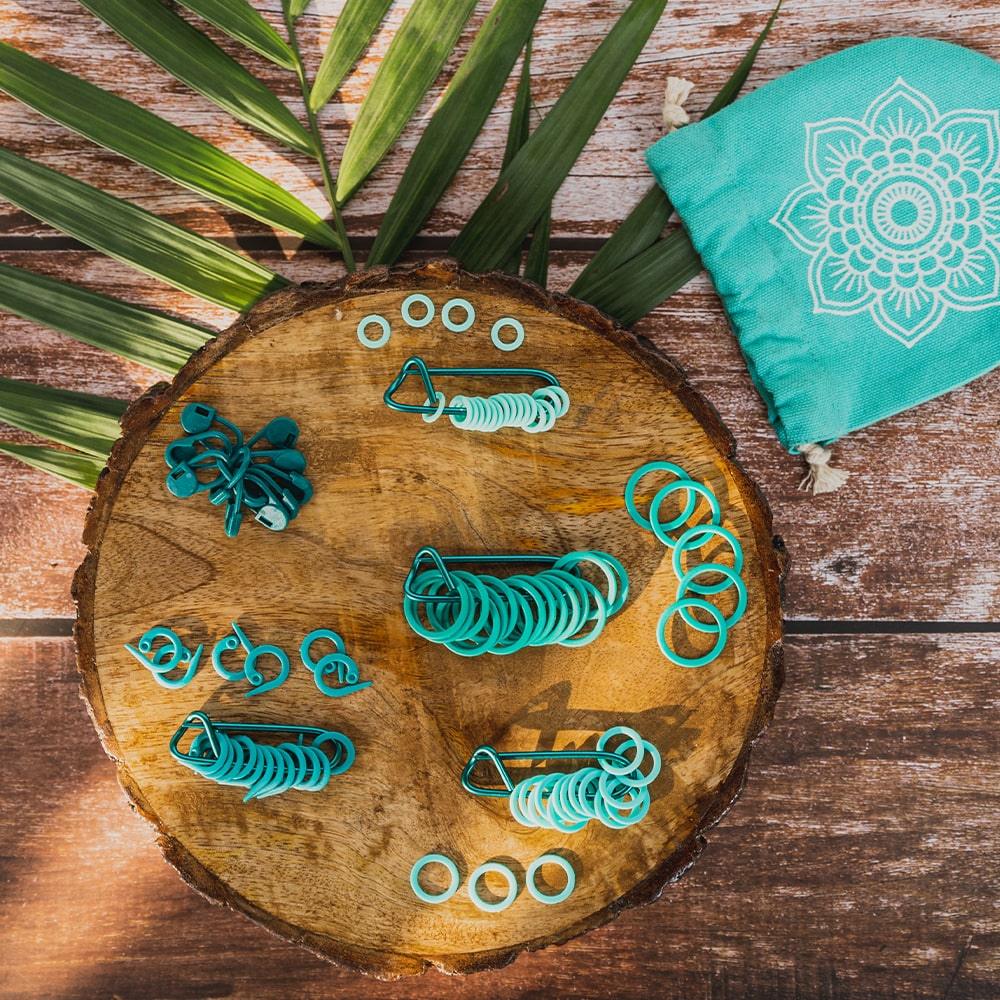 Una borsa multiuso in stoffa color verde acqua contiene tutti i segnapunti.